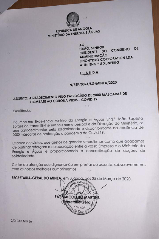 當?shù)貢r間4月24日,中國電建安哥拉代表處收到來自中國駐安哥拉大使館的表揚信,信中高度贊揚了中國電建安哥拉代表處在安哥拉進入國家緊急狀態(tài)的疫情期間,克服困難,對使館各項水電設備維修維護工作高度重視,多次選派專業(yè)技術人員前往使館協(xié)助檢修維護,為使館在疫情期間的正常秩序提供了有效保障。表揚信對中國電建“自強不息,勇于超越”的企業(yè)精神風貌和社會責任感給予了肯定,并感謝中國電建對使館工作一如既往的支持。